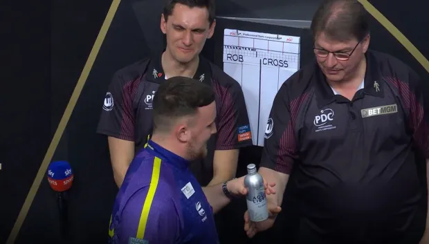Fresh off his dramatic entrance to the thumping beats of Pitbull’s “Greenlight,” the young star reached for his water bottle to stay hydrated amid the intense atmosphere. To his frustration — and the delight of cameras everywhere — the cap refused to budge. Without missing a beat, Littler danced across the stage and handed the stubborn bottle to marker Scott Gibley, one of the officials on duty. Gibley, with a broad smile, happily unscrewed the top while the entire arena watched. Sky Sports didn’t let the moment pass quietly; they broadcast the awkward exchange live and even treated viewers to a slow-motion replay, turning a simple hydration issue into one of the most endearing and widely discussed light-hearted incidents of the entire 2025 campaign.